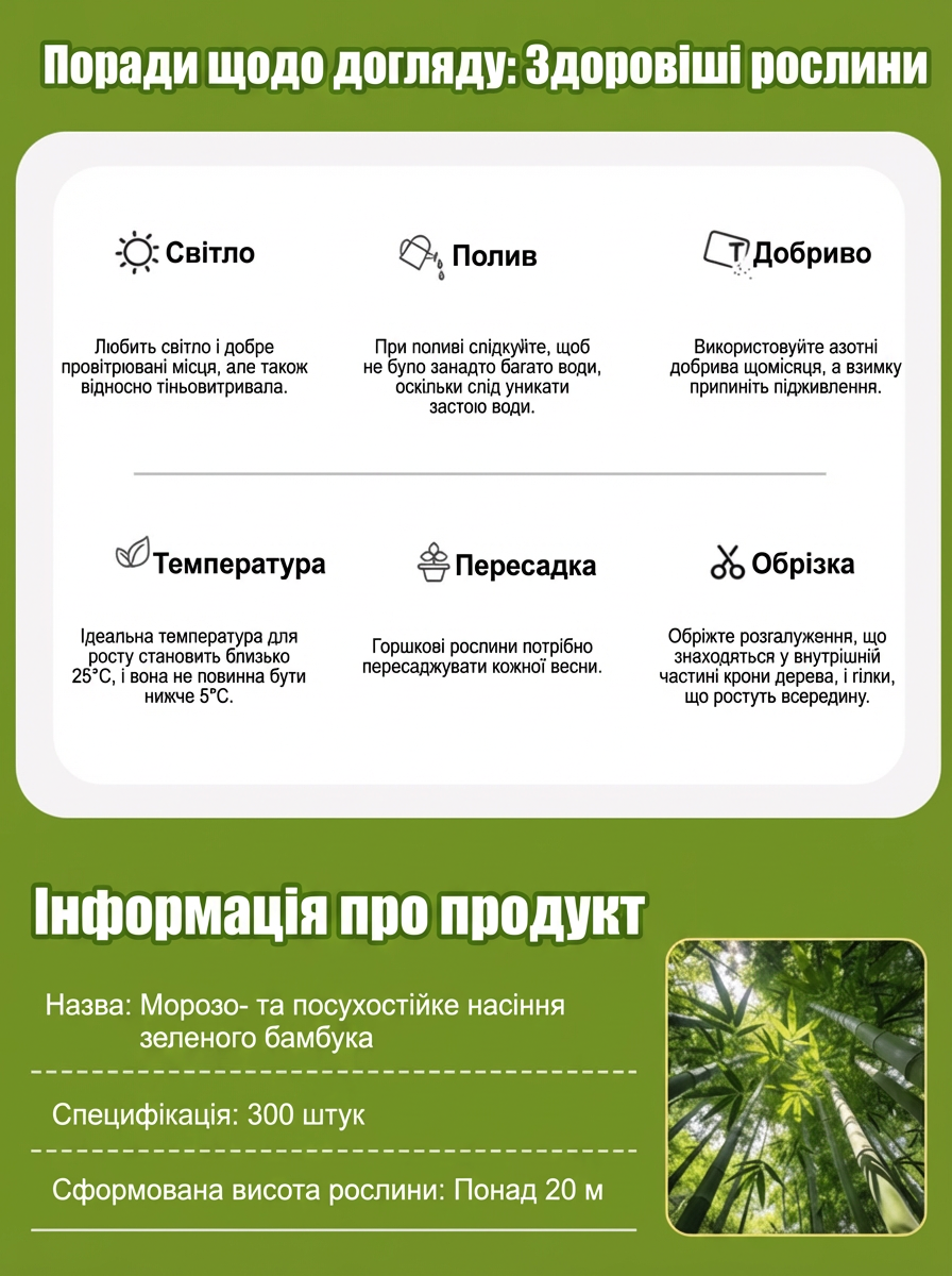 Купив набір на 600 насінин для створення живоплоту вздовж паркану. Результат перевершив очікування: бамбук росте неймовірно швидко, стіна виходить дуже щільною. Повітря біля альтанки стало відчутно свіжішим. Дуже задоволений якістю товару